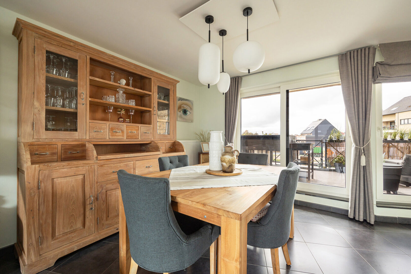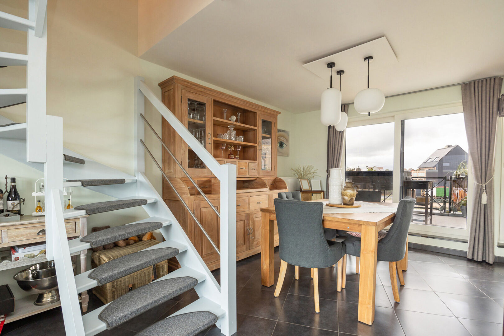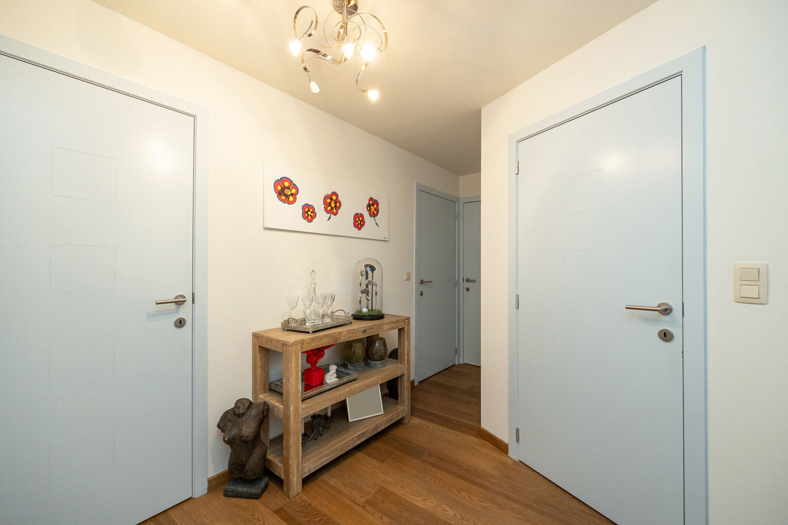 Het appartement bestaat uit een nette inkomhal met gastentoilet. De inkomhal geeft toegang tot de ruime woonkamer met gashaard, eetkamer en open keuken. Aansluitend aan de keuken vind je een uitgeruste berging met douche terug. Het eerste zuidgericht en ruim terras, waar het heerlijk vertoeven is, betreed je via de eetkamer. Het tweede terras, aan de straatkant, betreed je dan weer via de woonkamer.