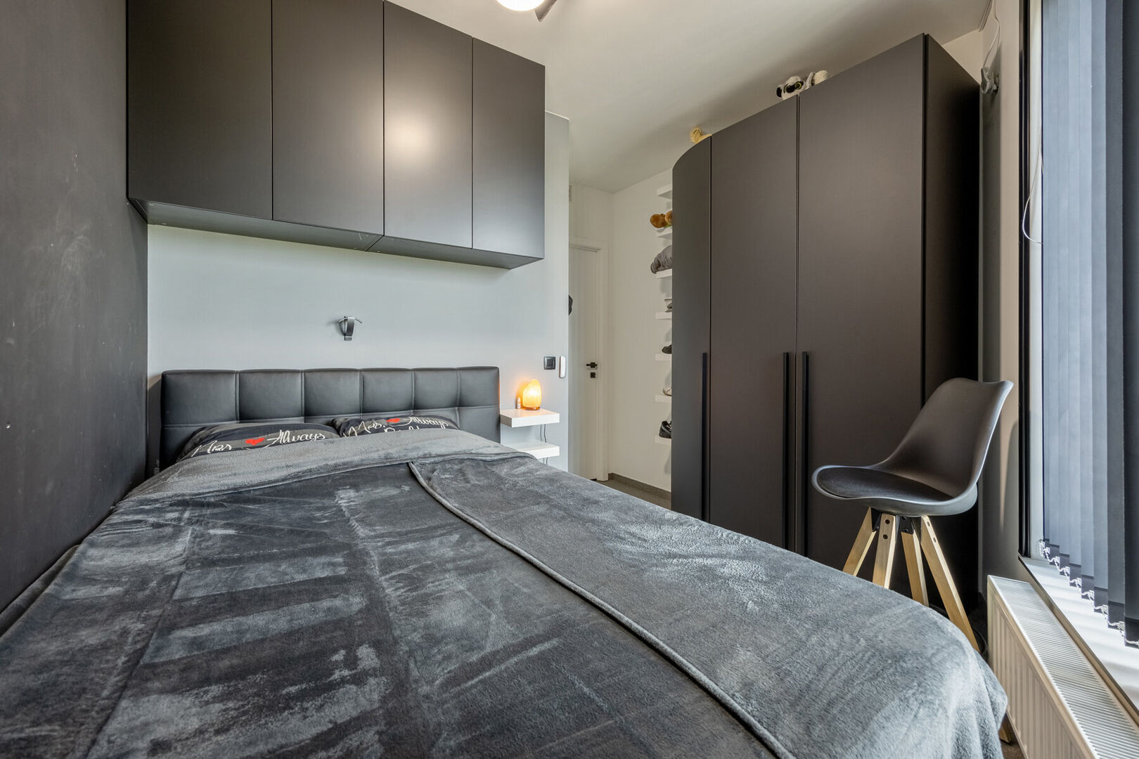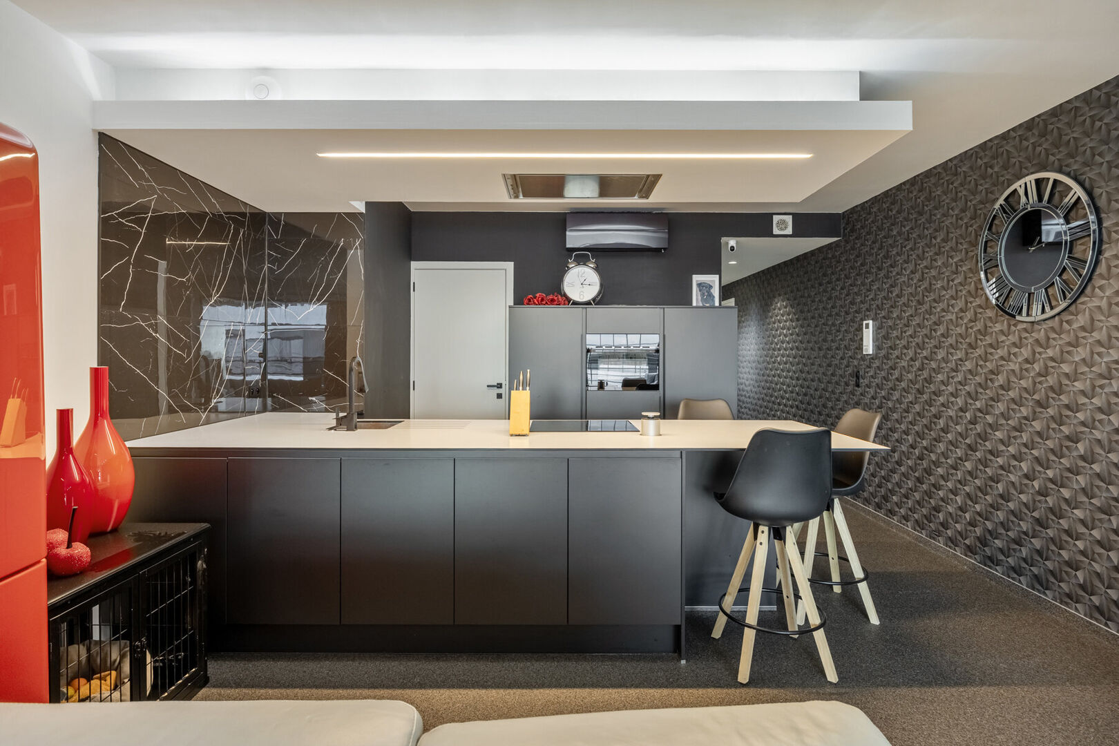 Dit appartement werd ingericht in strakke stijl. De doorgetrokken steentapijt leidt verder naar het zuidelijk georiënteerd, met bankiraï bekleed terras van 12m2. Voor de zonnige dagen is deze kant van het appartement voorzien van elektrische gordijnen aan de binnenzijde en airconditioning (eveneens in de master bedroom). Voor de koudere dagen, hangt de terrasverwarming reeds klaar.