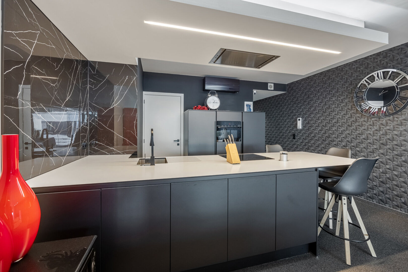 Je bereikt dit appartement via de lift of trap en stapt binnen in de diepe inkomhal met aan de linkerzijde eerst het gastentoilet. Daarna betreed je de woonkamer met open keuken en ingerichte berging. De open keuken bestaat uit een ruim kookeiland met inductie-kookvuur, ingebouwde afzuigkap, afwasmachine, combi-oven en vaste geïntegreerde ontbijthoek. Opberg- en werkruimte is hier voldoende aanwezig. Daarnaast zorgt de volledig ingerichte berging voor extra ruimte voor provisie en huishoudproducten.