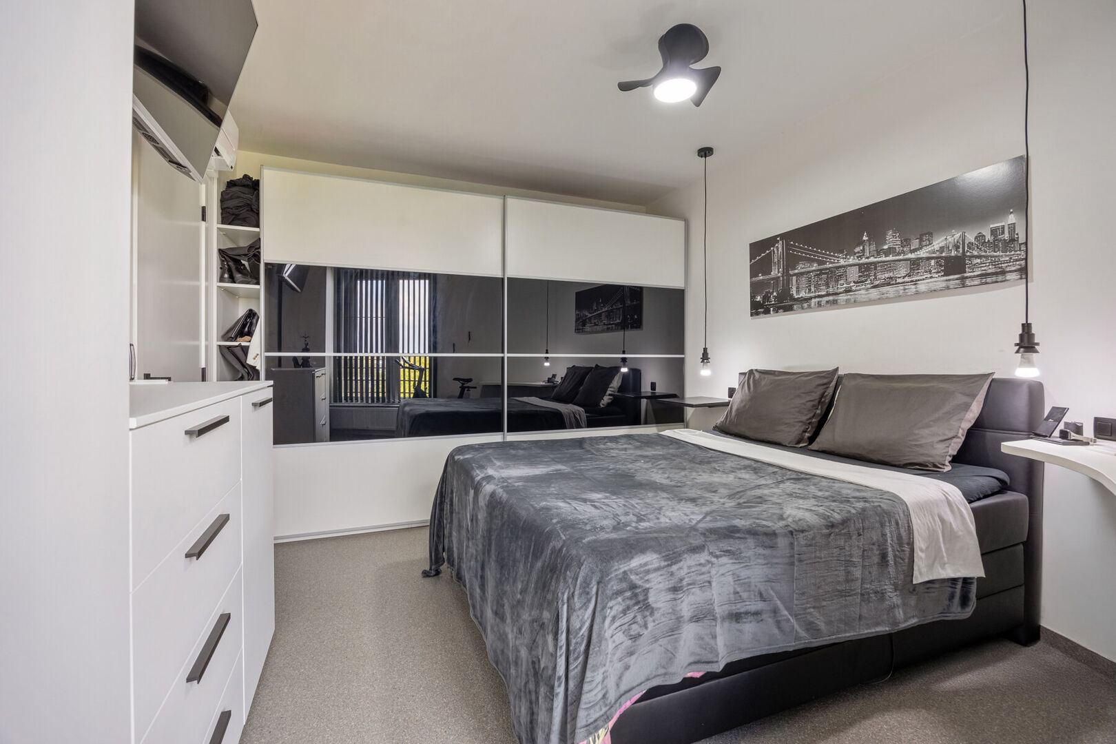 De hal leidt verder naar de badkamer die werd uitgerust met een ingebouwde washoek, een ruim badkamermeubel, extra kasten, handdoekenradiator en een XL-inloopdouche. Ten slotte leidt de nachthal naar de twee ruime slaapkamers, uitgerust met elektrische verduisteringsgordijnen.