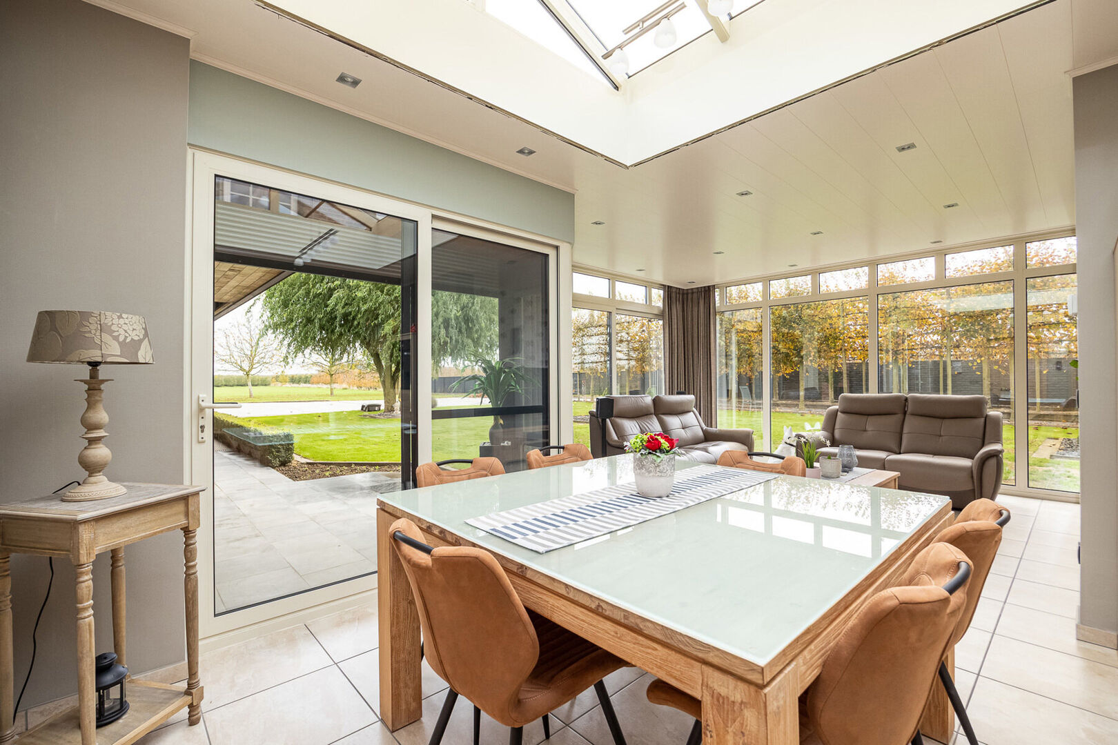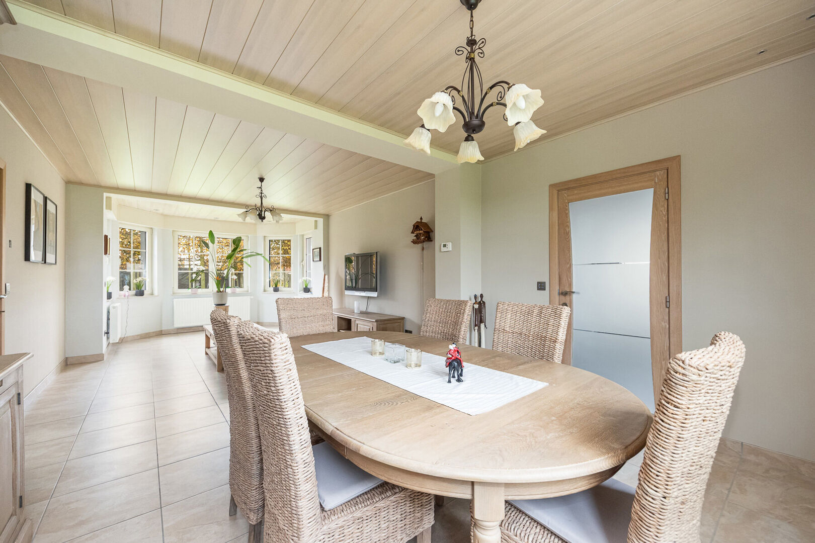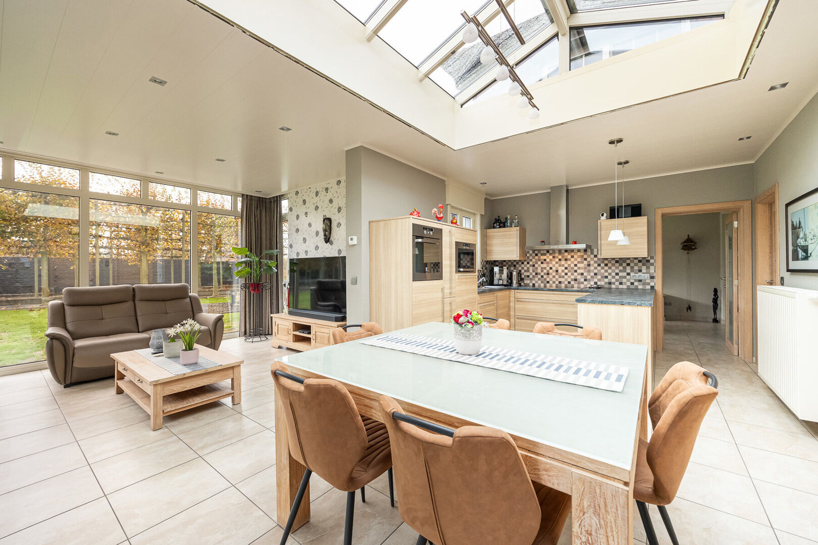 Binnenin vind je een aangename leefruimte met een warme, open sfeer. De keuken werd vernieuwd in 2007 en is volledig uitgerust met kwaliteitsvolle toestellen. Aansluitend bevindt zich een gezellige veranda, eveneens geplaatst in 2007, die overgaat in een overdekt terras waar het heerlijk vertoeven is in elk seizoen. De badkamers werden in 2025 volledig vernieuwd en stralen hedendaagse elegantie uit. De woning beschikt verder over drie ruime slaapkamers, dubbele beglazing (vervangen in 2000 en 2007), een energiezuinig EPC-label C en een recente mazoutketel uit 2006.