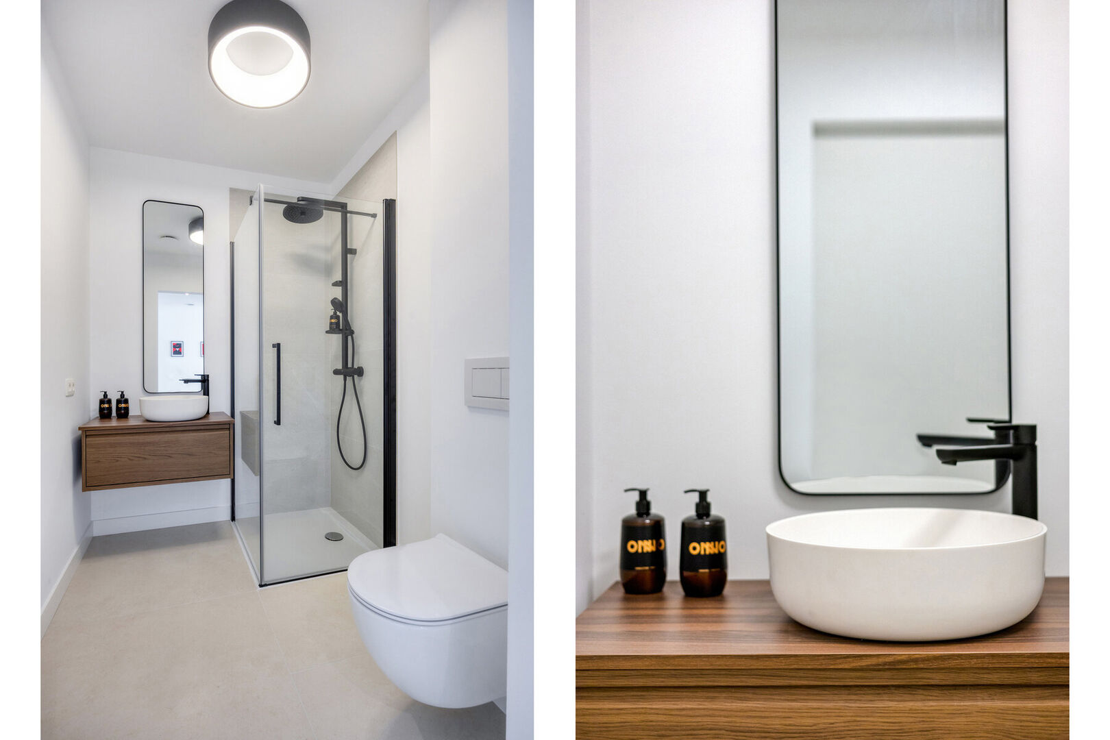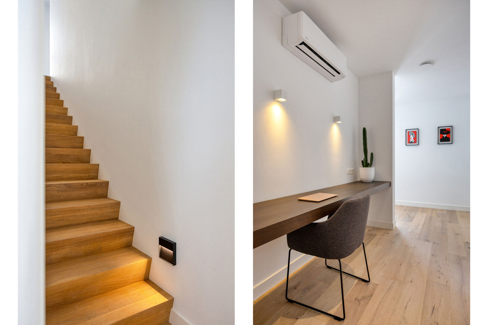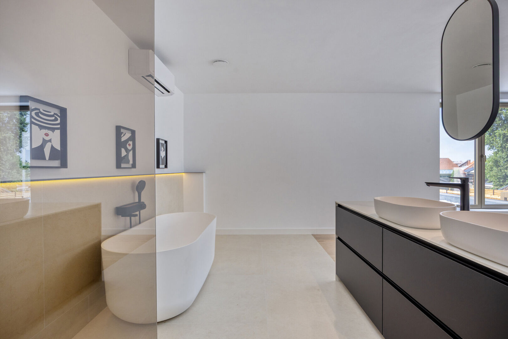 Op de eerste verdieping vinden we de nachthal, 2 badkamers en drie slaapkamers terug. De nachthal werd voorzien van een aparte open ruimte die kan dienen als 'workspace'. Hier werden reeds een bureaumeubel (inbouw) voorzien. De twee kinderkamers zijn meer dan ruim en bieden beiden plaats voor een dubbel bed. Voor de kinderen werd er bovendien een aparte badkamer met inloopdouche en toilet voorzien. De hoofdslaapkamer heeft meer weg van een luxe suite in een hotel dan van een gewone slaapkamer. De badkamer met dubbele inloopdouche, bad, toilet en make-up ruimte werd volledig geintegreerd in de slaapkamer. Ook hier werd aircoo voorzien, luxe ten top!