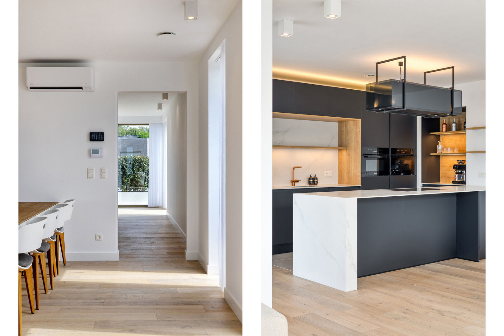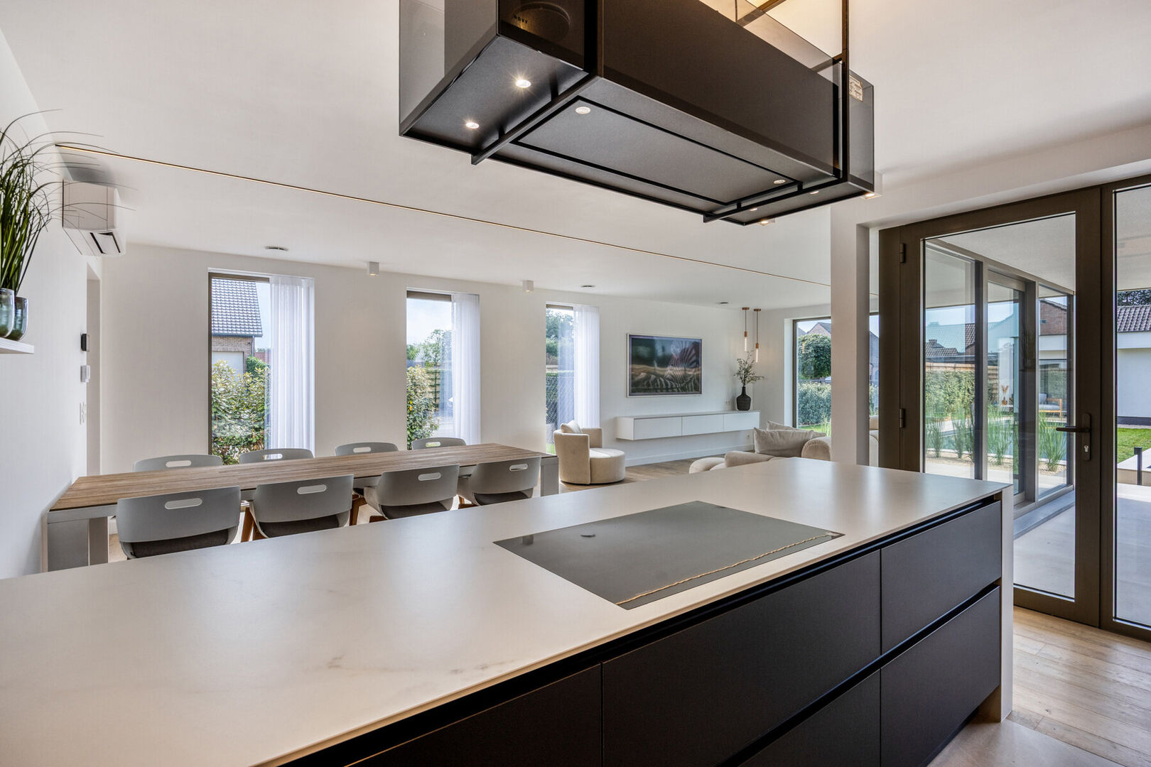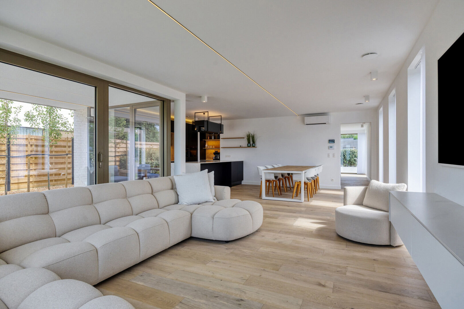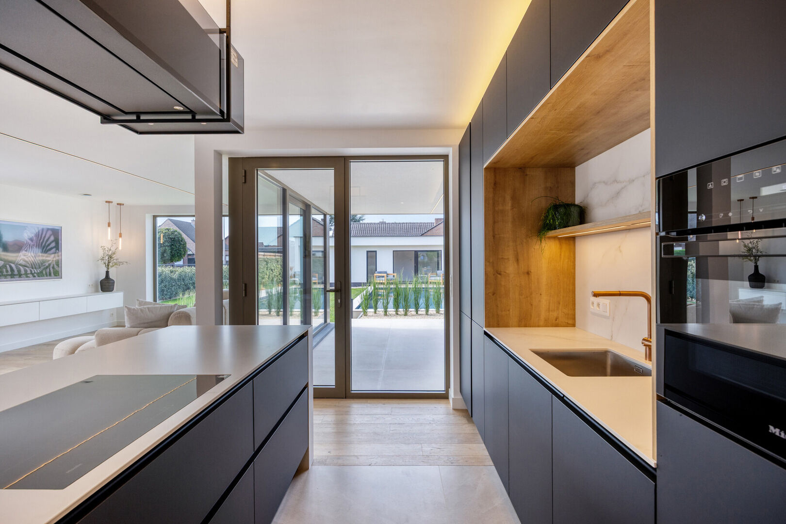 Binnen wordt u verwelkomd door een lichte, open, inkomhal die ons toegang geeft tot het gastentoilet, de trap naar de eerste verdieping, de wasruimte en de inpandige garage. De leefruimte ligt achteraan de woning en ademt luxe, kwaliteit en duurzaamheid. De leefruimte, met geïntegreerde open keuken, heeft zicht op tuin en op het zwembad. Hier ook weer enorm veel lichtinval door de zuid-west orientatie van de tuin. Middagzon op het zwembad en avondzon op het terras, heerlijk toch?