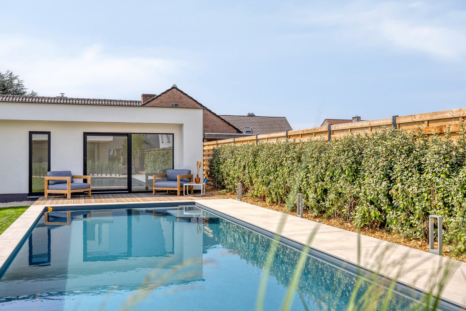 Buiten wacht pure verwennerij: een verwarmd privézwembad op hydrolyse (10,5m op 4m) met compleet afgewerkt poolhouse nodigt uit tot ontspannen of feestelijke zomerdagen. Dankzij de zuidwestelijke oriëntatie geniet u van maximale zon en bovendien een sfeervolle zonsondergang. Het overdekt terras garandeert bovendien droogte tijdens een typisch belgische zomer (zon met regenbuien).