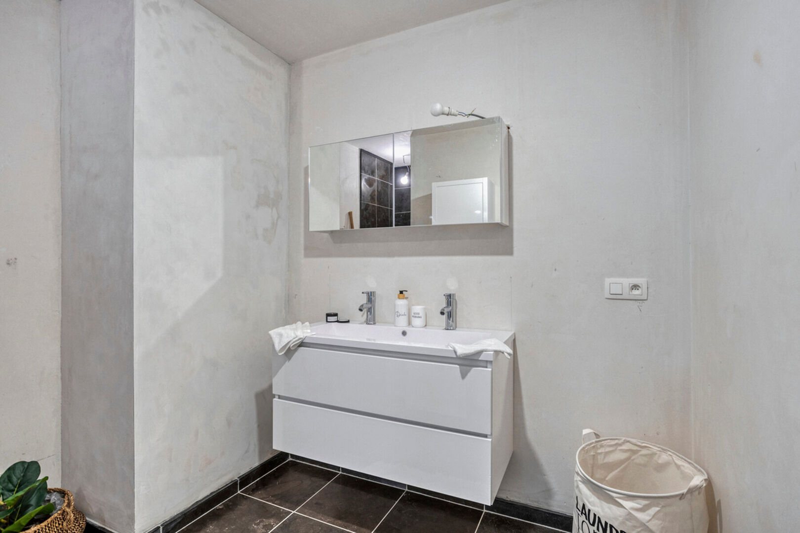 Aansluitend aan de keuken vinden we nog een ruime berging/wasruimte met alle nodige aansluitingen terug. Deze ruimte geeft op haar beurt toegang tot de inpandige garage.