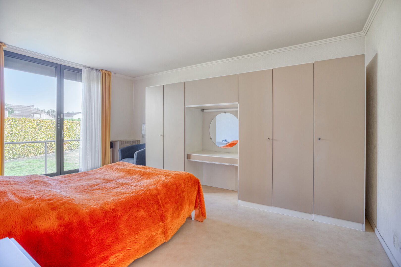 De gelijkvloerse verdieping bestaat uit een ruime inkomhal als centraal punt van de woning die alle ruimten verbindt. Aan de linkerzijde van de woning vindt men 4 slaapkamers, de badkamer met inloopdouche, het gastentoilet en de vestiaireruimte achteraan. Aan de rechterzijde tref je toegang naar de kelderverdieping, de lichtrijke woonkamer met houthaard en de gerieflijke keuken (met vernieuwde toestellen) met toegang naar het zonneterras.