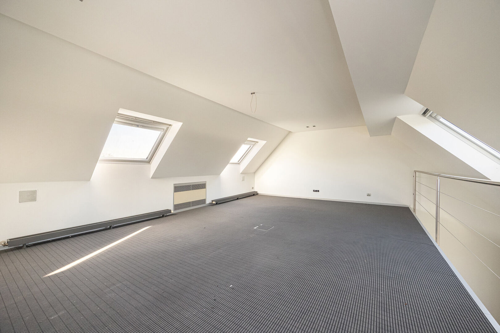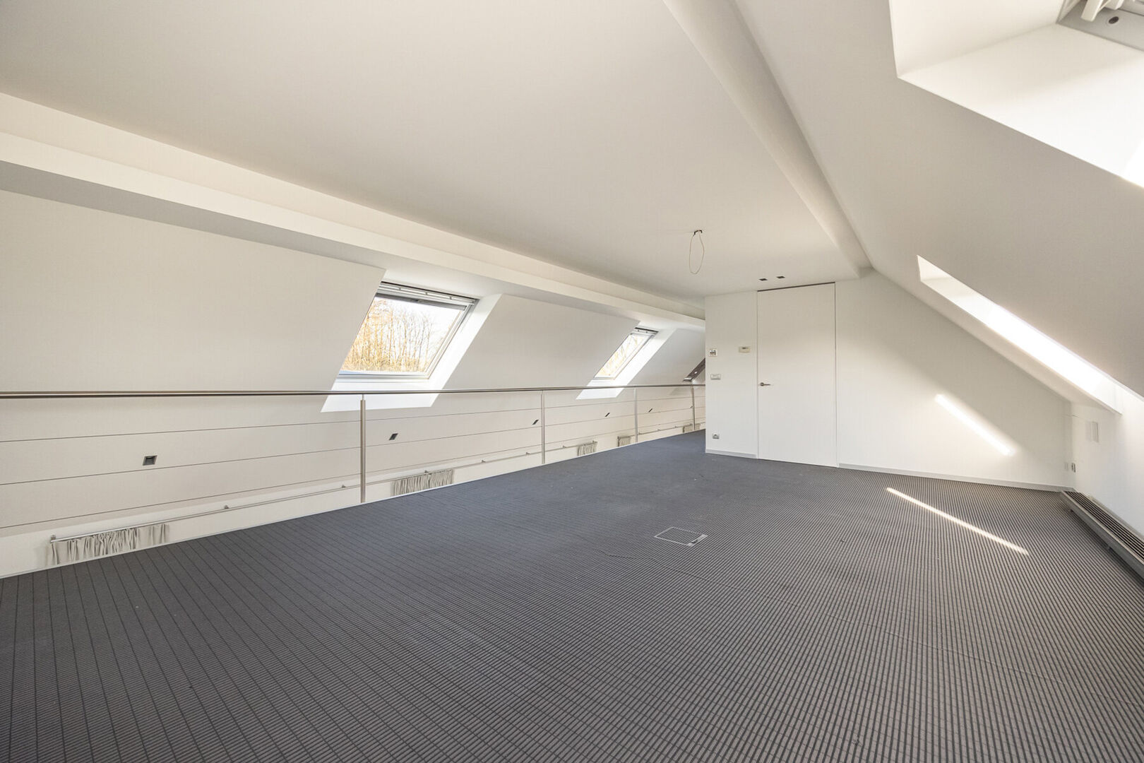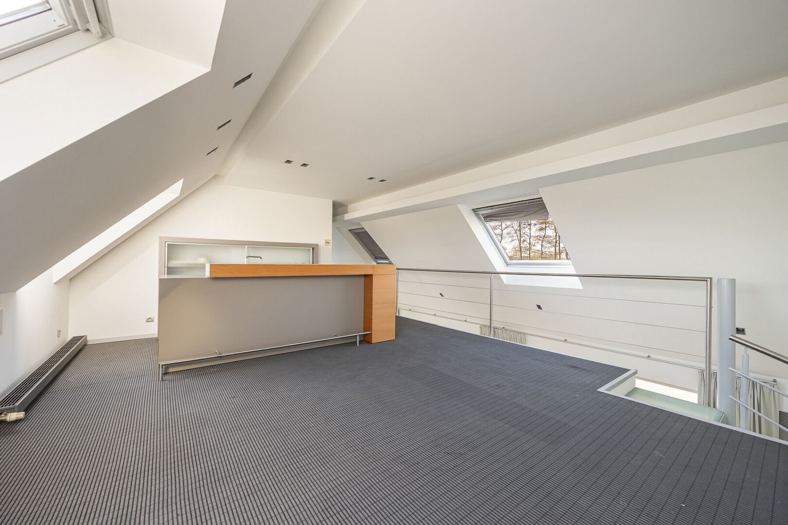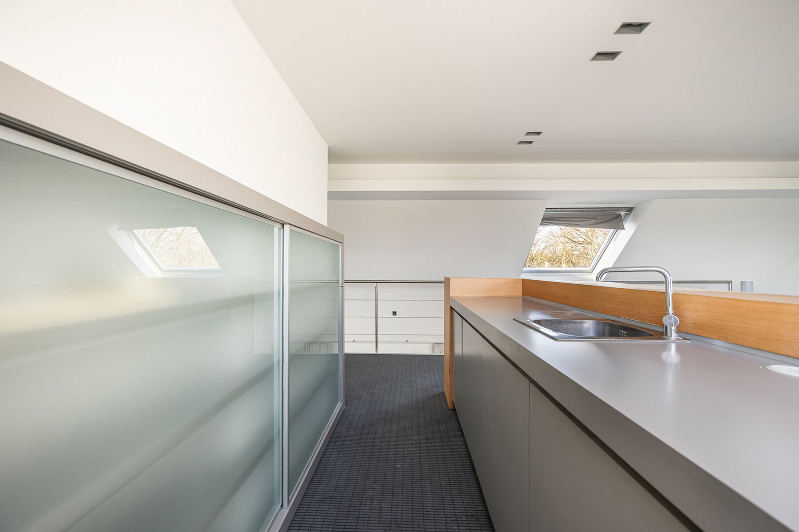 Op de derde verdieping maar wel in contact met de tweede verdieping treffen we nog eens 107m2 ruimte bestaande uit kantoorruimte en een (basis) keuken. Ook vinden we hier het opgesplitst sanitair gedeelte (toiletten etc).