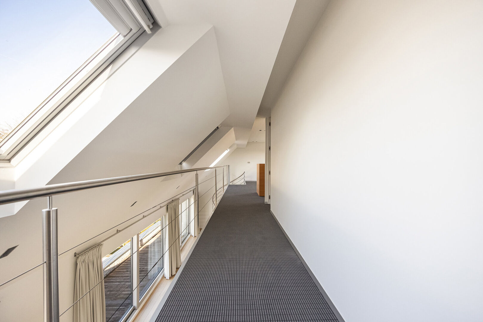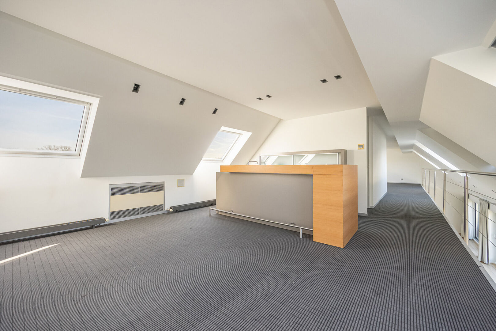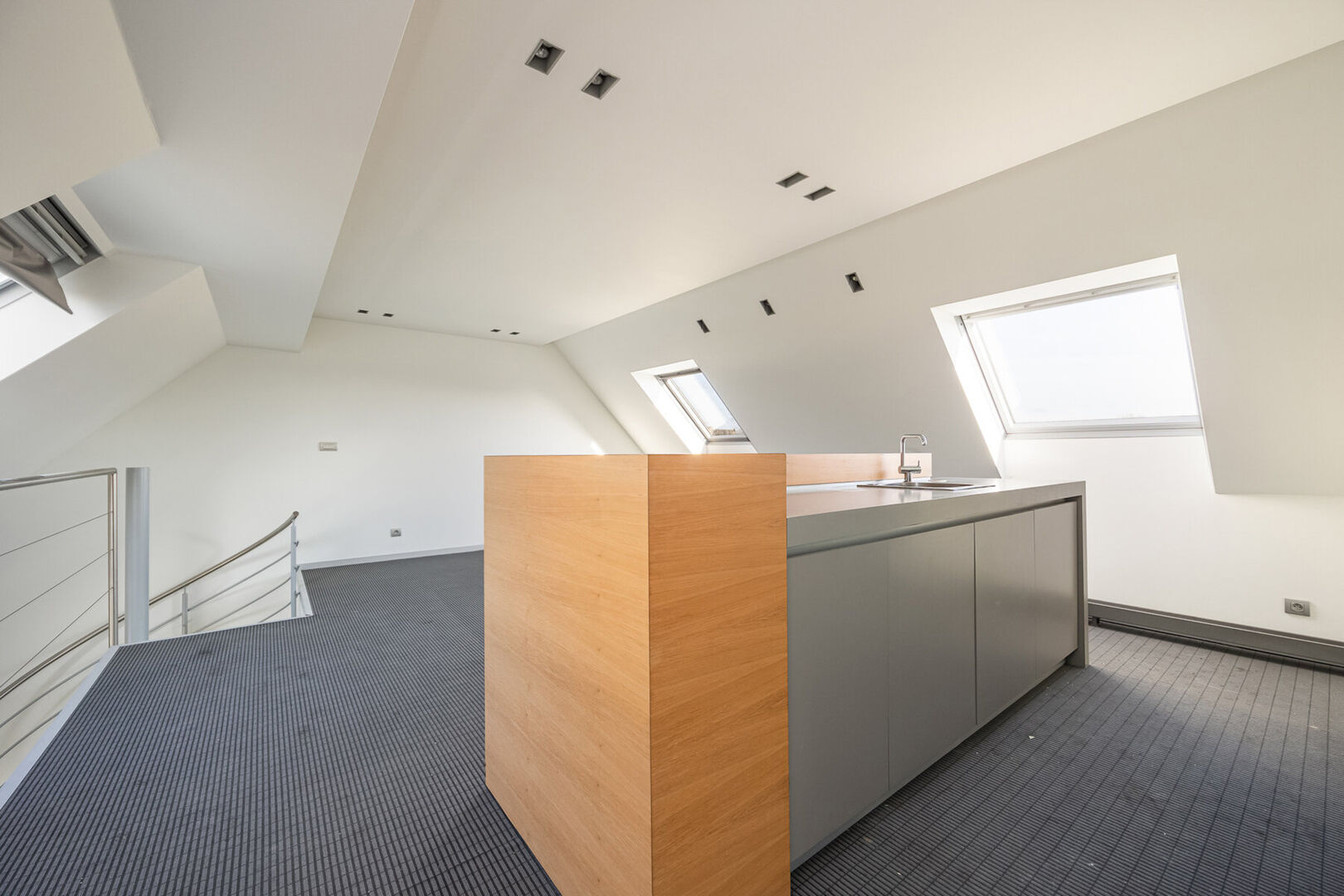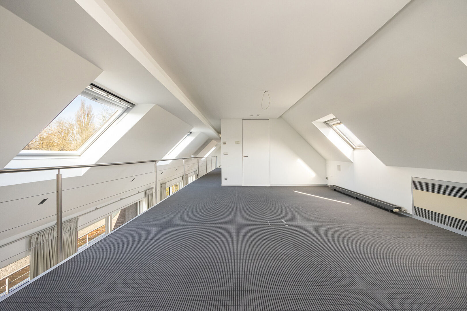 Op de derde verdieping maar wel in contact met de tweede verdieping treffen we nog eens 107m2 ruimte bestaande uit kantoorruimte en een (basis) keuken. Ook vinden we hier het opgesplitst sanitair gedeelte (toiletten etc).